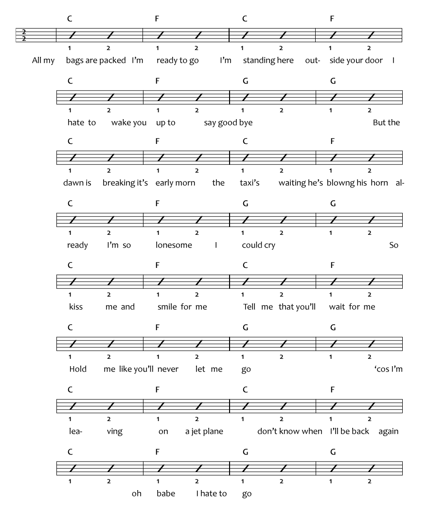 Now we will practice switching to and from the F chord using the song Leaving on a Jet Plane in C major key.